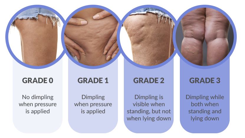 سلولیت با نشانه های خفیف (مرحله۱) متوسط (مرحله ۲) ​​و شدید (مرحله ۳ و ۴) شناخته می شود.