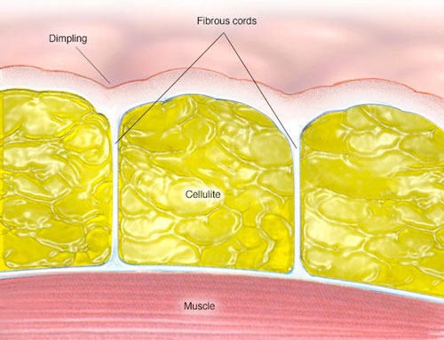 سلولیت به دلیل نحوه چیدمان چربی‌ها و اتصال پوست به عضله ایجاد می‌شود. زیر پوست، چربی‌ها قرار دارند و بالای آن‌ها، رشته‌های بافت همبند که مانند ستون عمل می‌کنند. وقتی چربی افزایش پیدا می‌کند یا بافت همبند انعطاف خود را از دست می‌دهد، چربی‌ها در بعضی نقاط به بالا فشار می‌آورند و این رشته‌ها آن‌ها را در نقاط خاص نگه می‌دارند. نتیجه‌اش همان بافت موج‌دار و ناصافی است که به آن سلولیت می‌گوییم.